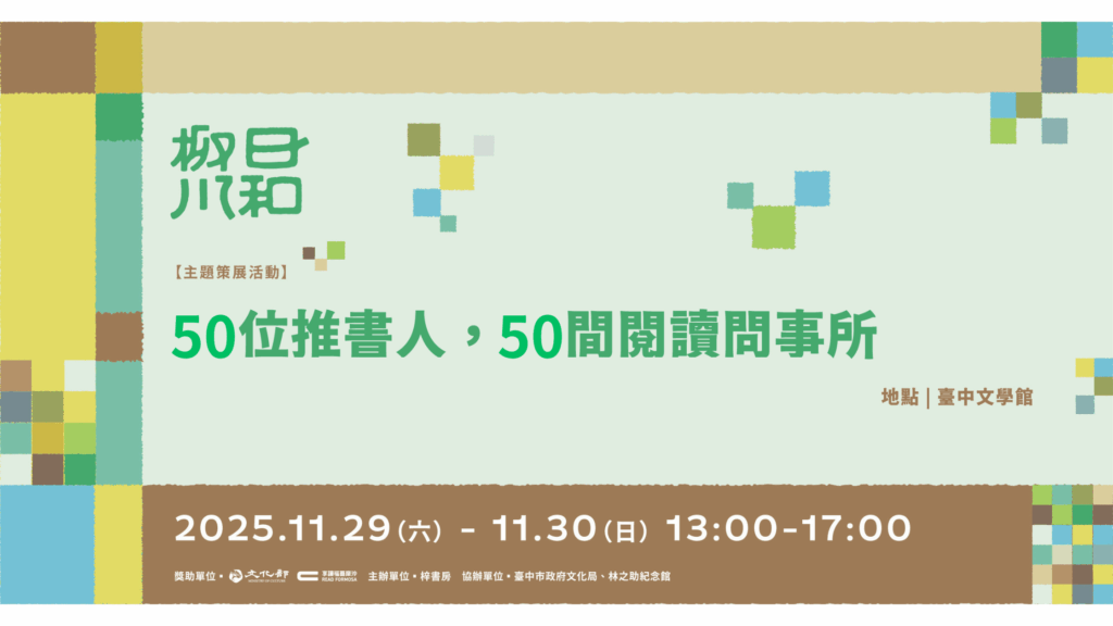 兩天的市集中,將有每時段 25 位推書人 在臺中文學館園區——他們來自不同閱讀社群、讀書會、教育工作者與創作者,各自帶著擅長的主題與書單,提供讀者一對一的閱讀建議。