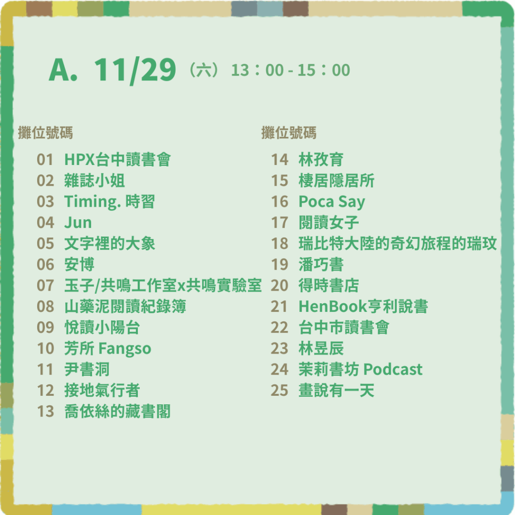 - A 時段|11/29(六)13:00–15:00