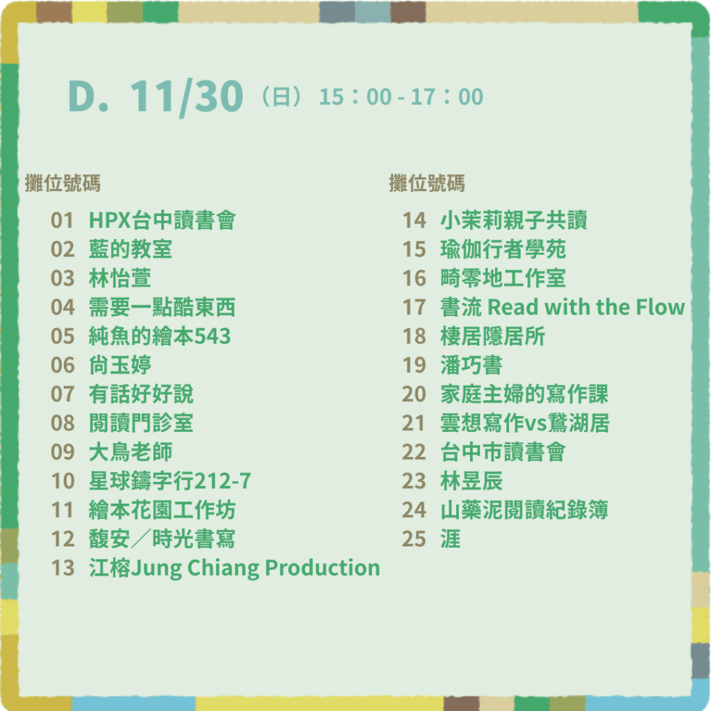 - D 時段|11/30(日)15:00–17:00